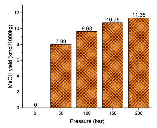 First of all, in order to investigate the reaction conditions of methanol synthesis, the syngas circulation system is not considered in our simulation. The methanol synthesis reactor temperature is an influential parameter on the methanol yield. Figure 10 shows the effect of temperature on methanol production between 150 and 350 °C. The methanol yield is improved with increasing reaction temperature from 150 °C to 250 °C, reaching a maximum of 7.99 kmol/1000 kg at 250 °C. This trend is consistent with the kinetics of methanol synthesis that high temperatures favor its production. However, when the temperature increases from 250 °C to 350 °C, yields decrease significantly. This phenomenon is due to CO2 liquefaction, which is an exothermic reaction. With respect to methanol synthesis thermodynamics, the methanol synthesis reaction is favored at low temperatures. Figure 10 indicates that the optimal temperature for methanol synthesis is around 250 °C, which is in agreement with various studies reported [,]. In those works, the typical operation temperature for methanol synthesis is in the range of 220 °C to 280 °C.