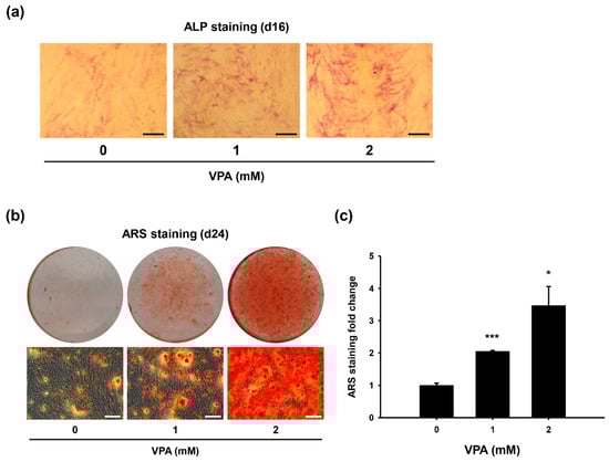 HDFs were cultured in osteogenic medium supplemented with VPA for 16 days, and the ALP activities were analyzed (Figure 1a). As the concentration of VPA increased to 2 mM, there was an increase in ALP activity. HDFs were cultured in osteogenic medium supplemented with VPA for 24 days, and stained with ARS to estimate calcium deposition (Figure 1b). VPA at a concentration of 2 mM induced relatively large amounts of calcium deposition, whereas VPA at 1 mM induced some visible amount of calcium deposition compared to the osteogenic medium alone (Figure 1b). Then we quantified the ARS fold change after the treatment of VPA. It was clearly shown that the amount of ARS-stained calcified matrices increased according to VPA treatment in a dose-dependent manner (Figure 1c). Hence, the results demonstrated the potential of VPA as a potent small molecule for inducing osteoblastic conversion.