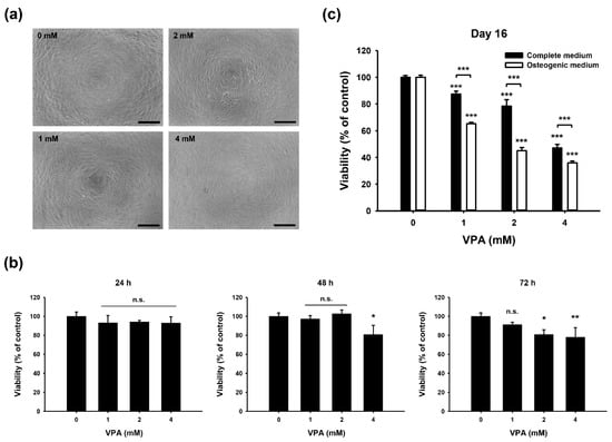 Cytotoxicity of VPA on HDFs. (a,b) HDFs were cultured in the osteogenic medium supplemented with VPA as indicated. (a) Morphologies were observed in cells treated with VPA for 72 h. The concentration of VPA is indicated in the upper left of each image. Scale bar, 200 μm. (b) Cell viability was measured by the MTT assay after VPA treatment for 24, 48 h, or 72 h, respectively. Error bars indicate the standard deviation (n = 3 per group) and statistical significance was determined using one-way ANOVA with Tukey’s post hoc test in comparison to the non-treated control, * p < 0.05, ** p < 0.01, n.s. = not significant. (c) Cell viability was measured by the MTT assay after VPA treatment in complete media or osteogenic media for 16 days, respectively. Error bars indicate the standard deviation (n = 3 per group) and statistical significance was determined using one-way ANOVA with Tukey’s post hoc test in comparison to the non-treated control, *** p < 0.005. Statistical significance was determined using Student’s t-test in the comparison between groups cultured in complete medium and osteogenic medium at the same VPA concentration, *** p < 0.005.