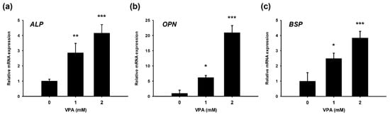 HDFs were cultured in osteogenic medium supplemented with VPA for 16 or 24 days, and analyzed for the expression of osteogenic markers (Figure 3). As the concentration of VPA increased to 2 mM, there was an increase in the mRNA level of alkaline phosphatase (ALP), an early osteogenic marker, at Day 16 (Figure 3a). Similarly, when the concentration of VPA was increased to 2 mM, an increase in the mRNA level of osteopontin (OPN) and bone sialoprotein (BSP), both of which are late osteogenic markers, was observed at Day 24 (Figure 3b,c). The results demonstrate that VPA induces all early and late osteogenic differentiation-related gene (ALP, OPN, BSP) expression patterns during direct conversion of HDFs cells in vitro.