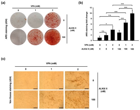 Osteoblast-like phenotypes were induced in HDFs cultured with VPA and specific inhibitor for activin-like kinase 5 (ALK5i II). (a–c) HDFs were cultured in the osteogenic medium supplemented with VPA and ALK5i II as indicated. (a) After culturing for 24 days, calcium deposition was assessed by ARS staining. (b) Quantified ARS fold change after the co-treatment. Error bars indicate the standard deviation (n = 3 per group) and statistical significance was determined using one-way ANOVA with Tukey’s post hoc test, * p < 0.05, *** p < 0.005, n.s. = not significant. (c) After culturing for 24 days under co-treatment conditions, calcium deposition was assessed by Von Kossa staining. Scale bar, 200 μm.