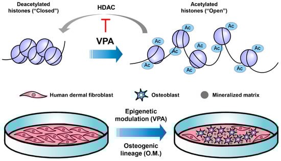 Schematic illustration of increased direct conversion efficiency of somatic cells into osteoblasts and mineralization by supplementation of VPA in osteogenic medium (O.M.). VPA promotes chromosomal remodeling and maintains acetylated histones as an “open form” of the chromatin structure by acting as an inhibitor of HDAC.