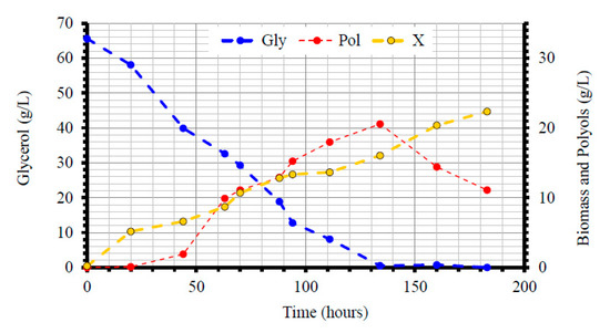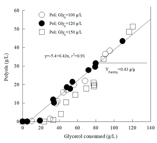 In the above-mentioned figure, the results concerning the production of polyols in the trial in which Gly0 ≈ 70 g/L were not incorporated, since in the latter case notably lower total polyols quantities, accompanied by remarkably depleted yield YPol/Gly values and higher yeast dry biomass quantities compared with the experiments where Gly0 ≈ 100, 120 and 150 g/L, were recorded (see Table 1). Moreover, as in the previously mentioned flask cultures (“effect of different glycerol sources under nitrogen limitation”), in this second set of experiments (Gly0 ≈ 70, 100, 120 and 150 g/L) ammonium nitrogen was depleted from the medium at t ≈ 50–55 h after inoculation; in the second set of trials, the initial NH4+ concentration was ≈ 550 mg/L, while NH4+ concentration at t ≈ 50–55 h after inoculation became ≈25 ± 10 mg/L, andtherefore, nitrogen limitation, accompanied by polyols secretion was noted. In the early stages of the cultivation (t ≤ 50 h after inoculation), thus, no polyols biosynthesis was observed. Nevertheless, and despite the fact that at the early culture steps glycerol did not contribute to polyols production, the representation of Pol produced f (glycerol consumed) and the linear regression performed for the batch-flask runs carried out makes sense, as most of the experimental points were found after nitrogen depletion where glycerol assimilation mostly contributed to the synthesis of polyols, whereas the correlation coefficient of the regression (r2 = 0.91) is quite satisfactory (Figure 2).