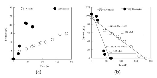 In the next step of this investigation, the bioprocess of glycerol fermentation by Y. lipolytica LMBF Y-46 was scaled-up in a bench-top laboratory-scale bioreactor (active process volume = 2.0 L) which allowed fine pH control and dissolved oxygen measurement. Trials with Gly0 concentration adjusted to ≈100 g/L were performed ((ΝH4)2SO4 at 2.0 g/L and yeast extract at 3.0 g/L were set into the medium). The choice of Gly0 ≈ 100 g/L was based on the results indicated in Table 1; precisely, in flask cultures with this Gly0 concentration, glycerol was almost completely consumed by the microorganism in a not excessively high incubation time (c. 180 h), while equally, DCWmax concentration was substantially high not being seriously influenced by the inhibition exerted due to high Gly0 concentrations into the medium (see Table 1). The obtained results in the equivalent trials between the shake-flask and the bioreactor culture are depicted in Table 3, while the evolution of DCW and glycerol in the two experiments is presented in Figure 3a,b. From the obtained results it can be indicated that drastically different kinetic and physiological profiles were recorded between the two experiments; in the bioreactor trial, much higher total biomass production occurred. This biomass value was obtained significantly more rapidly than the flask culture. On the other hand, the μmax value between the shake-flask and the bioreactor trial (for the calculation see Section 2.2) was not substantially different between the two experiments (μmax ≈ 0.16 h−1 for both performed cultures). In contrast, the biomass production rate rX (, in g/L/h; calculation performed when X obtained its maximum value), was drastically higher in the bioreactor experiment compared with the shake-flask one (viz. 0.506 vs. 0.08 g/L/h). Moreover, glycerol consumption was drastically higher in the bioreactor trial compared with the flask culture (see Table 3 and Figure 3b). As previously, fitting of the experimental data through linear regression of the remaining glycerol concentration f (fermentation time) demonstrated linear glycerol consumption rate rGly (although, r2 value was only 0.90 for the bioreactor experiment vs. 0.99 for the shake-flask trial; see Figure 3b) that was 0.52 g/L/h for the flask experiment and >3-fold time greater for the bioreactor culture (the rGly value for the latter case was = 1.85 g/L/h).