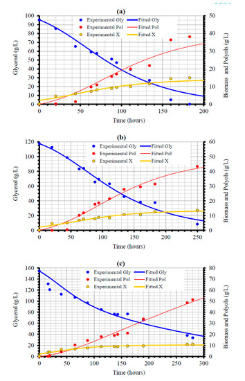 Experimental data and fitted values showing the evolution of biomass (X), glycerol (Gly) and total polyols (Pol) concentration during growth of Yarrowia lipolytica on glycerol at: ≈100 g/L (a); ≈120 g/L (b); ≈150 g/L (c), initial substrate concentrations in shake-flask experiments under nitrogen-limited conditions. Culture conditions as in Table 3. Each experimental point is the mean value of two independent determinations (SE ≤ 18%).