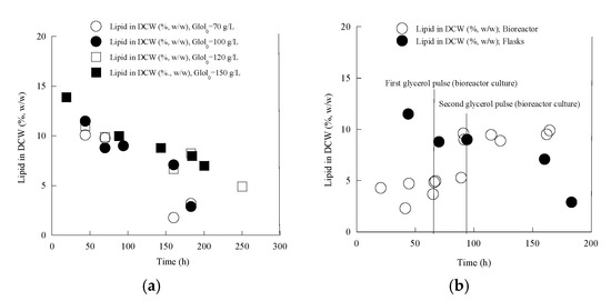 Kinetics of intra-cellular lipids produced per unit of dry cell weight (%, w/w) of Yarrowia lipolytica LMBF Y-46 during growth on pure glycerol, at various initial glycerol concentrations (Gly0) imposed under nitrogen-limited conditions in shake-flask experiments (a) and shake-flask vs. pulsed fed-batch bioreactor experiments (in the latter case, for the shake-flask experiment, Gly0 concentration was ≈100 g/L). (b). Culture conditions as in Table 1 and Table 3. Each point is the mean value of two independent determinations (SE ≤ 18%).