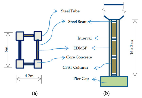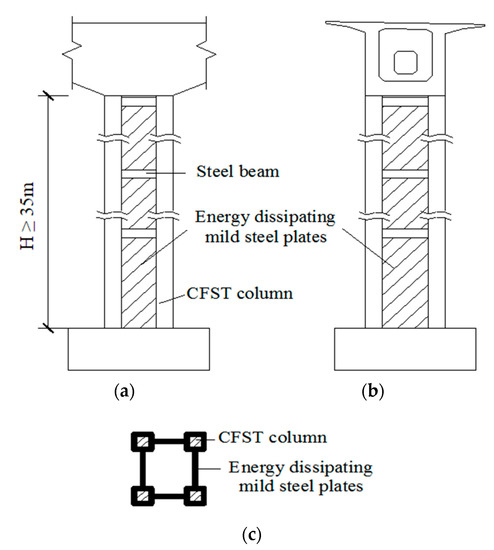- Under the design-based earthquakes (DBEs), the EDMSPs are intentionally designed for energy dissipation while CFST columns are designed to remain elastic. The seismic input energy is dissipated by the hysteretic behavior of the EDMSPs, which in return reduces the stiffness of the pier and mitigates the seismic damage. Only slight damage or inelastic states are allowed for I-shape steel beams.