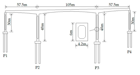 In this study, a tall-pier bridge located at the highway in the mountainous area is used as the prototype bridge as shown in Figure 2. The bridge has two side spans of 57.5 m and a main span of 105 m. The superstructure is a prestressed concrete continuous rigid girder, with a variable box section. C50 concrete with a compressive strength of 50 MPa is used in the girder. The height of the girder at the mid-support is 6.0 m. It reduces to 2.6 m at the mid-span and the end of the side span. The lower edge of the girder is a second-order parabola. The P2, P3 tall piers are RC box section piers with a wall thickness of 0.8 m and a height of 48 m. The P1, P4 piers are RC box section piers with a wall thickness of 0.8 m and a height of 30 m. The piers are constructed with C40 concrete. The width of the tall pier in the transverse direction is 6 m and the longitudinal width is 4.2 m. The GPZ(II)3DX and GPZ(II)3SX (“GPZ(II)” indicates a type of basin rubber bearing, “3” indicates the the bearing capacity is 3000 kN, “SX” and “DX” for single-directional bearing and bi-directional bearing, respectively) bearings are installed between the superstructure and the top of P1 and P4 piers.