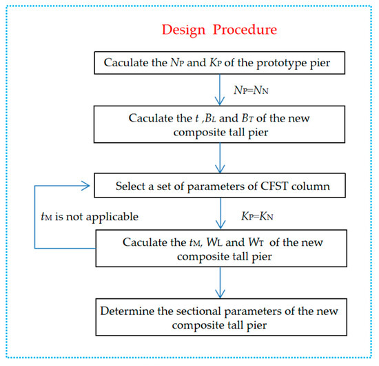 According to the equivalent principle in terms of the vertical axial load-carrying capacity, the longitudinal and transverse dimensions of CFST columns, BL and BT, the thicknesses of steel tube t, can be obtained. Note that due to the numerous interrelated parameters, the values of these parameters are not unique. Therefore, a set of parameters is selected empirically. Then the longitudinal and transverse lengths of EDMSPs, WL and WT, the thicknesses of EDMSPs tM, are obtained based on the equivalent stiffness in the longitudinal direction as shown in Equation (1). Finally, the sectional parameters of the new composite tall pier are determined. The design procedure is presented in Figure 4.