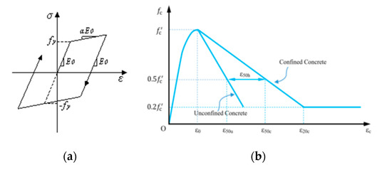 The finite element models of the prototype bridge and the new composite tall-pier bridge are established in ABAQUS. For the prototype bridge, the superstructure and piers are simulated by the B31 elements(“B”indicates beam element, “3” is for three-dimensional beams, and “1” is for linear interpolation). The girder is assumed to remain elastic with C50 concrete(Ec = 30 GPa, fck = 50 MPa). The reinforcement is defined by the *rebar keyword (i.e., a method to define a integration point with different material fiber in the beam element section). The Kent-Scott-Park model [38] and the USteel01 model (kinematic hardening elastoplastic uniaxial constitutive model) in the PQ-Fiber subroutine developed by the Department of Civil Engineering of Tsinghua University are adopted for the constitutive models of C40(Ec = 30 GPa, fck = 40 MPa) unconfined concrete, and the HRB400 (Es = 210 GPa, fy = 400 MPa, and α = 0.01) reinforcement, as shown in Figure 5, respectively. The basin type bearings are simulated by the link elements. The stiffness is infinite along the fixed direction. In the active direction, the bidirectional elastoplastic model is adopted for the link element.