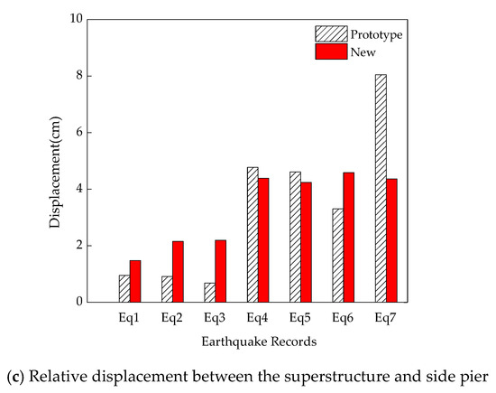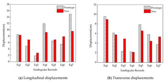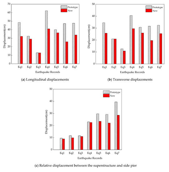 For the new composite tall piers, under the SLEs, the maximum curvature at the top and bottom of the tall piers are 0.00082 and 0.00018, respectively. Both values are less than the yield curvature of 0.00240. Meanwhile, the maximum stress of the steel beams is 75 MPa, which is less than the yield stress of 345 MPa. Besides, the maximum stress of EDMSPs equals 81 MPa and is less than its yield stress. Therefore, the new composite tall-pier bridge is in the elastic state. Table 5 shows the average values of maximum displacements under different seismic actions. The results indicate that the lateral displacements of the new composite tall-pier bridge are close to the prototype bridge under the SLEs. Both the seismic responses of two bridges meet the requirements of damage limitation state when subject to the SLEs. Figure 7 compares the maximum displacement responses of the bridge under the SLEs. Although the maximum displacements of new composite tall-pier bridge are larger than the prototype one under some ground motions considering SLEs, the seismic performances of two bridges are similar. Both the prototype and the new bridges remain elastic without damage.