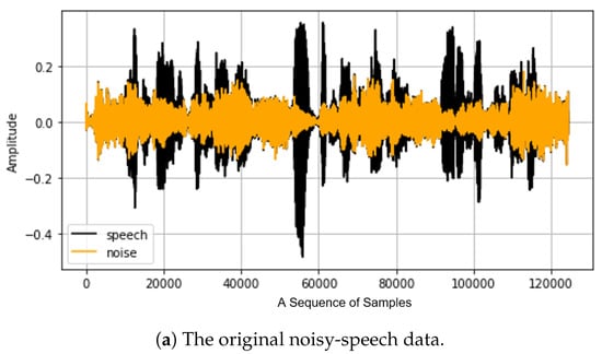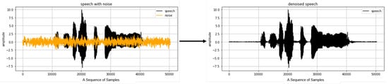 Denoising is the process of extracting only the clean speech from a mixed sound of speech and noise. Figure 1 shows denoising of speech data. The main goal of denoising is to enhance the perceptual quality of speech and the robust speech recognition. Applications of denoising include cellular and teleconference communications affected by background and channel noise [1]. The denoising performance has a considerable impact on both the comprehensibility and the post-processing efficiency of the speech data. Therefore, various denoising methods have been studied [2]. However, as shown in Figure 1, we indicate that denoising, i.e., mitigating the noise affecting a speech signal, is a difficult process because the noise and speech coexist at the same time point.