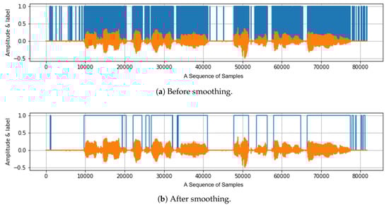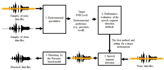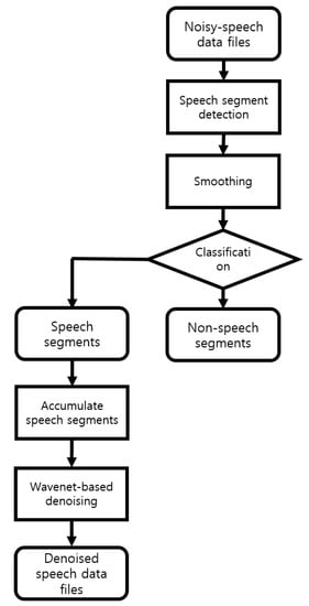 Figure 5 describes the overall process of denoising into which we apply the preprocessing based on the speech segmentation detection. As shown in Figure 2, the selected speech segment detection method for a target environment is used for a denoising process. As the input data sets, we use speech data files with noises formatted in wav where each sample is recorded at a rate of 16 Khz [36]. First, we separate the noisy speech data file into the speech and non-speech segments by the selected speech segment detection method. Second, we perform the smoothing process. It accumulates audio signals of 200 time points before and after each time point, which corresponds to smoothing on a running window of 25 ms. Then, if more signals out of the accumulated 200 signals belong to speech signals than non-speech signals, the time point is classified as speech signal; otherwise, as non-speech signal. Third, we accumulate all the extracted speech segments into a single speech data file. Fourth, we put the speech data file as the inputs of the Wavenet-based denoising method and obtain the final denoised result.