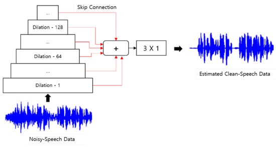 Wavenet is an internal speech DNN model within a voice synthesis model, Tacotron [18], to create raw sound waveforms. Since Wavenet enables the effective understanding of speech data features, it has been proposed as a denoising tool [13]. Figure 3 describes its overall architecture [13], which allows to identify the comprehensive features of speech data effectively using a dilated convolution layer, which enables to extend the reception field with a small number of layers. It also tries to avoid overfitting and to reduce computational costs by skipping several layers randomly using the concept of skip connection. For these reasons, Wavenet-based denoising performs better compared to Wiener filter [4]. Specifically, in a speech quality assessment involving 33 participants, Wavenet-based denoising is scored 3.6 while Wiener filter 2.92 [13].