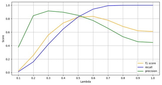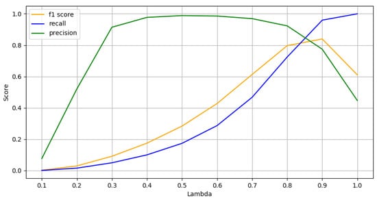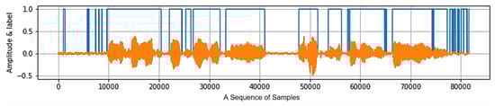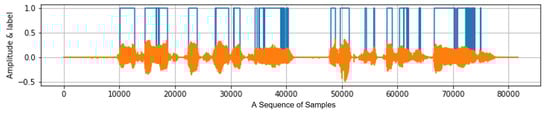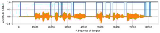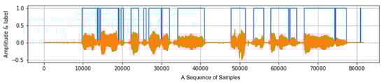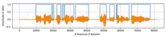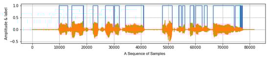 In entropy-based filtering, is also an important parameter affecting the accuracy of the method like in energy-based filtering. Figure 11 shows the recall, precision, and F1 score of entropy-based filtering as is varied from 0.1 to 1.0. We indicate that the most accurate result of entropy-based filtering is observed when is 0.6, where the F1 score is the highest. Figure 12 illustrates the result of entropy-based filtering where the audio signal is presented in orange and the speech segment is in blue.