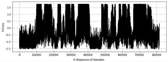 Figure 10 illustrates the entropy value calculated according to Equation (8). In Equation (9), we define the threshold. is used as a weight from 0 to 1 between the maximum and minimum entropy value. Then, if for a time point t is greater than the threshold in Equation (9), we determine it as the speech segment.