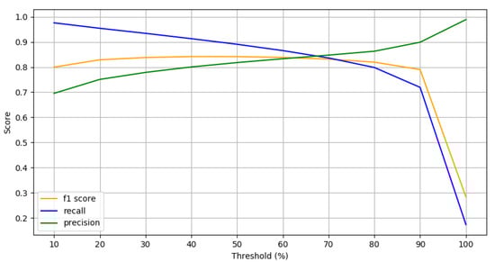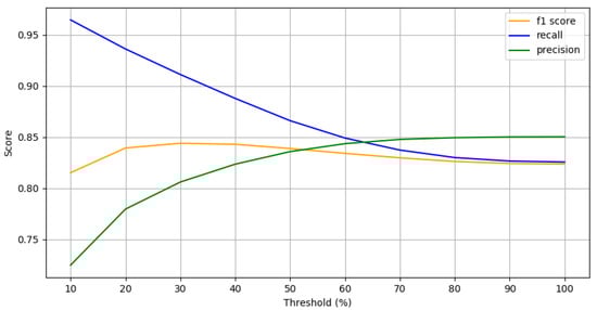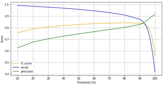 In the energy-based filtering method, in Equation (5) is an important parameter affecting the accuracy of the method. Figure 7 shows the recall, precision, and F1 score of energy-based filtering as is varied from 0.1 to 1.0. For all the figures showing the recall, precision, and F1 score of the speech segment detection methods, we use a total 824 validation noise-speech data files and the corresponding clean speech data files (See Section 4). We use the same data files to measure the accuracy of all the methods in this section. We indicate that the most accurate result of energy-based filtering is observed when is 0.9, where the recall and F1 score are the highest. We note that we can increase the recall to 100% by setting as 1.0, but precision dramatically decreases. This implies that we have an adequate for a target environment.