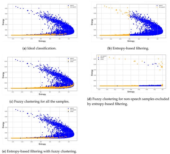We analyze the results of the filtering method, fuzzy clustering, and filtering with fuzzy clustering. Here, we show the result of entropy-based filtering, fuzzy clustering, and entropy-based filtering with fuzzy clustering. Figure 19 represents the distribution of data sets according to each method where the x-axis represents the entropy and y-axis the energy by the audio signal. Figure 19a represents the answer classification of speech and non-speech segments. Figure 19b represents the classification after entropy-based filtering. Here, we indicate that this simple filtering method can effectively classify speech and non-speech signals, but some speech signals are classified as non-speech signals. Figure 19c represents the classification of fuzzy clustering for all the audio signals. Figure 19d represents the classification of fuzzy clustering only for non-speech signals that have been excluded by entropy-based filtering. Here, we note that, fuzzy clustering can recover some signals that have been excluded by entropy-based filtering. Figure 19e represents the final result of entropy-based filtering with fuzzy clustering.