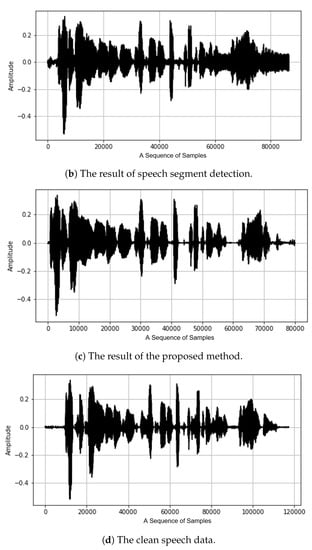 Figure 21 and Figure 22 illustrate the denoised results of the proposed method representing two actual sample data. Figure 21a and Figure 22a illustrate the original noisy-speech data, which were the target for denoising. Figure 21b and Figure 22b illustrate the result of the speech segment detection. Here, we note that the non-speech segments were excluded while the noises in the speech segments are maintained. Figure 21c and Figure 22c illustrate the denoised result of the proposed method; Figure 21d and Figure 22d the clean speech data. We note that the noises were eliminated in Figure 21c and Figure 22c compared to Figure 21b and Figure 22b and the denoised result data became close to the clean speech data. We also indicate that the time axis of the proposed method was shortened by processing of the speech segment detection, which improved the denoising speed.