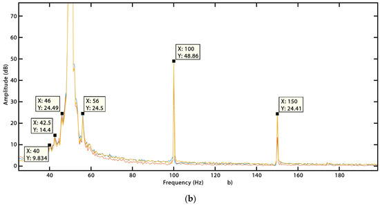 By applying the FT to the current signal of the generator under study, Figure 2a,b are obtained for one and three phases, respectively. In the graphs, harmonics with frequencies of 40, 42, 46 and 56 Hz can be distinguished, which, according to references [42,76,90], are related to stator failures, broken bars, and phase imbalance. In addition, as described in reference [42], rotor failures are manifested by harmonics of the fundamental frequency (3, 5, 7, etc.), which reinforce the indications of bar failure.
