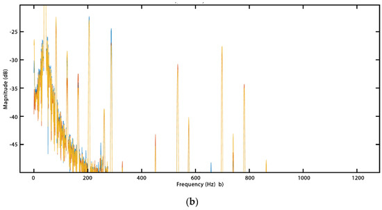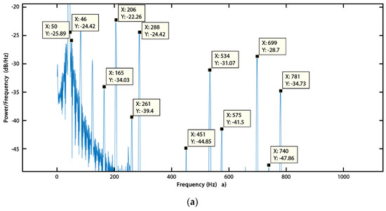 The frequency components are very close to the central frequency, and depending on the window used, the width of the lobes can be very large, and the identification of faults by means of the FFT is difficult, making it necessary to resort to other variables and techniques such as the power spectral density (PSD) [91]. In MATLAB, we obtain an improved version of the PSD, which is shown as a Welch periodogram (see Figure 3). In this approach, by definition, MATLAB applies the Hamming window and displays the part of the graph corresponding to the real values. Unlike the case of the classic FT, in the spectrum obtained by the Welch periodogram, a greater number of frequency peaks can be distinguished, such as 30, 46, 54, 63, 124, 165, 261, 451, 534, 575, and 781 Hz. Although the composition of the spectrum is uniform, there are differences in the magnitudes of the components. These differences can also be observed when comparing the three phases of the generator (see Figure 3b).