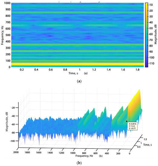 As we have been able to verify from the techniques used so far, time-domain analysis does not provide the frequency spectrum, while the analysis in the frequency domain does not provide the moment at which the components are produced. By applying the algorithm of reference [94] to calculate the STFT in MATLAB, Figure 5 is obtained. Parts a and b of this figure emphasize how both the fundamental frequency and its components, which remain invariant over time, stand out in terms of their energy (yellow color). Part b reveals harmonics very close to the fundamental (green and orange color), which correspond to the frequencies of 10 and 5 Hz mentioned above.