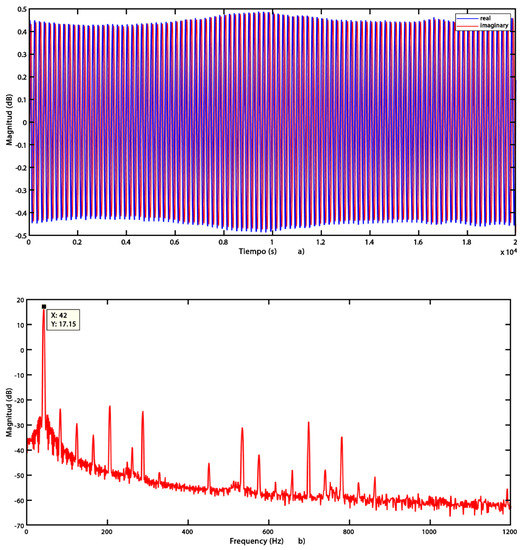 According to reference [96], when the carrier signal frequency is on the order of kHz, bearing failures cannot be detected. However, by applying envelope analysis at the lower frequencies, detection is possible. This is the foundation on which techniques such as the shock pulse meter (SPM) and spike energy are based. HT demodulation, either directly to the current signal or to the Park transformation, is used to detect various types of rotor and stator faults, such as broken bars and inter-turn short circuits. In general, signal demodulation is usually the first phase, prior to the application of other mathematical models that are used to improve detection and diagnosis [84,85,97,98]. By applying the HT to our signal, Figure 7a is obtained, and we can distinguish the real and imaginary parts. Taking this last part and calculating the PSD, the spectrum of Figure 7b is obtained, which is similar to those obtained using the FFT and Welch’s periodogram. However, the components associated with broken bars cannot be distinguished, as it was done with the previously applied techniques.
