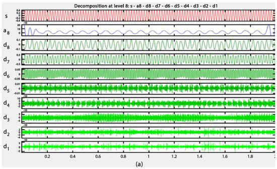 As described in reference [57], techniques such as the CWT and discrete FT have disadvantages when the analysis is carried out with small loads and close to the synchronism speed. According to this author, a more effective method for detecting faults and analyzing the evolution of their severity is to use a Kalman filter, which is computationally more efficient. Since the CWT requires considerable computational effort and generates too much data, an alternative is to filter the signal iteratively in such a way that each frequency band obtained is again decomposed and so on until we obtain several high-resolution frequency components, on which we perform the analysis. In other words, the alternative is to discretize the parameters of both scale and time, leading to the discrete wavelet transform (DWT), also called multiresolution analysis [58]. According to reference [59], calculating the coefficients throughout the scale increases the calculation time, while according to reference [60], it can be shown that the CWT is not useful for detecting faults or torque variations; therefore, the use of the DWT is preferable. According to that report, the signal must first be decomposed by the CWT with a Daubechies 8 (Db8) mother function, and then the FFT is used to analyze the spectrum components.