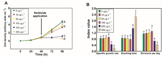 Regarding cell density, after 48 h exposure P. tricornutum cultures were negatively affected, in particular by the two highest concentrations of glyphosate-based herbicide (250 and 500 µg L−1), with slight decreases in cell density observed only at lower concentrations (50 and 100 µg L−1) (Figure 1A).