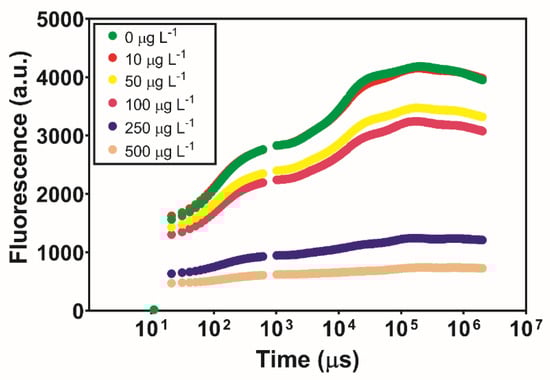 Apart from the lowest concentration (10 µg L−1), the Kautsky plots showed decreasing fluorescence values with increasing herbicide quantities (Figure 2), particularly at the highest glyphosate-based herbicide concentrations (250 and 500 µg L−1).
