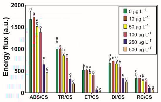 The analysis of the photochemical process from light-harvesting electronic transport, represented by the four main energy fluxes, demonstrates the effects of exposure of the different herbicide concentrations in P. tricornutum cultures (Figure 3).