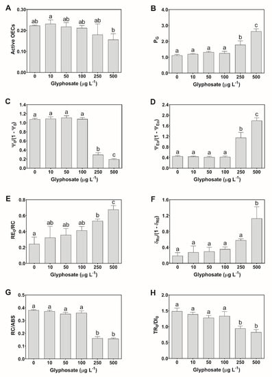 While the active OECs showed a decrease only under the highest glyphosate-based herbicide concentration (500 µg L−1), the PG, the grouping probability that correlates with the disconnection between the two PS II units, increased with the highest glyphosate-based herbicide concentration (250 and 500 µg L−1) (Figure 4).