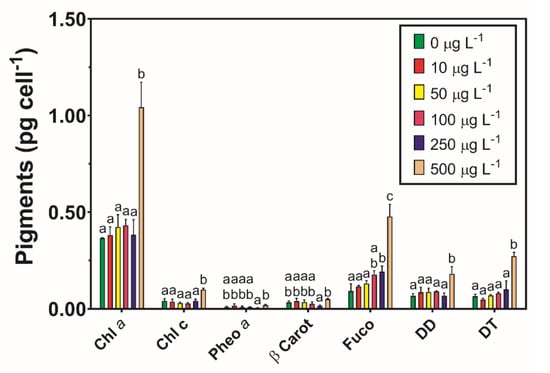 Overall, the highest glyphosate-based herbicide concentration (500 µg L−1) elicited significant increases in pigment concentrations (Figure 5).