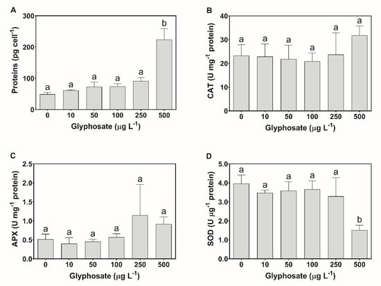 Protein content (A), catalase (CAT, B), ascorbate peroxidase (APX, C), and superoxide dismutase (SOD, D) enzymatic activities in Phaeodactylum tricornutum following a 48 h exposure to a glyphosate-based herbicide formulation in different concentrations (mean ± s.d., n = 3, different letters indicate significant differences at p < 0.05).