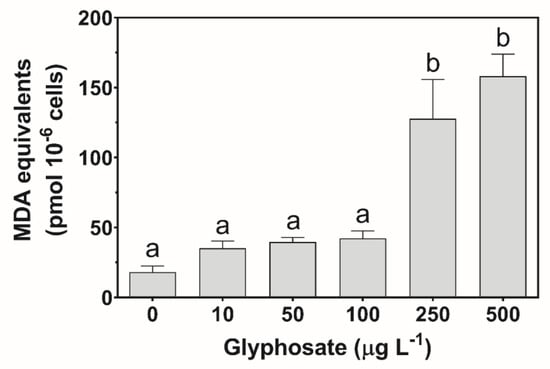 Lipid peroxidation quantification, measured as malondialdehyde (MDA) equivalents, in Phaeodactylum tricornutum following a 48 h exposure to a glyphosate-based herbicide formulation in different concentrations (mean ± s.d., n = 3, different letters indicate significant differences at p < 0.05).