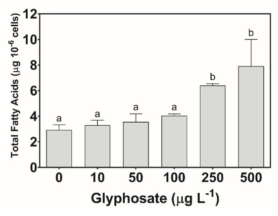 Total fatty acid content in Phaeodactylum tricornutum following a 48 h exposure to a glyphosate-based herbicide formulation in different concentrations (mean ± s.d., n = 3, different letters indicate significant differences at p < 0.05).