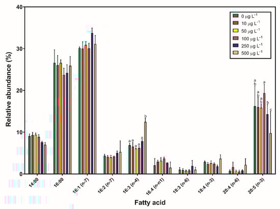 Fatty acid profile in Phaeodactylum tricornutum following a 48 h exposure to a glyphosate-based herbicide formulation in different concentrations (mean ± s.d., n = 3, different letters indicate significant differences at p < 0.05).