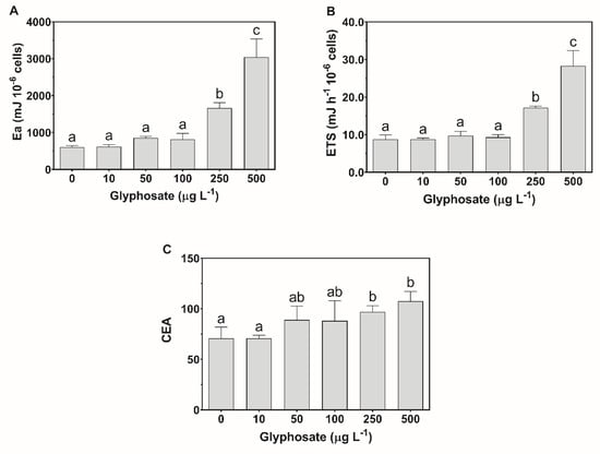 Energy balance ((A), energy available (Ea); (B), energy consumption rate (ETS); (C), cellular energy allocation (CEA)) in Phaeodactylum tricornutum following a 48 h exposure to glyphosate-based herbicide formulation in different concentrations (mean ± s.d., n = 3, different letters indicate significant differences at p < 0.05).