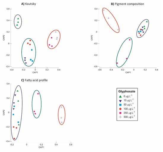 Each variable was evaluated through one-way ANOVA with Tukey’s multiple comparisons test (GraphPad Prism 6.03 for Windows, GraphPad Software, San Diego, CA, USA), regarding differences among glyphosate-based herbicide concentrations. The data obtained from the Kautsky plots, pigment, and fatty acid profiles, were used as the basis for the construction of the respective resemblance matrixes based on the Euclidean distances between samples. To classify and separate the different treatment groups, statistical multivariate models based on the Kautsky plot, pigment composition, and fatty acid profile variable were generated using Canonical Analysis of Principal Coordinates (CAP), through the non-parametric multivariate analysis packages in Primer 6 software as described previously in other works [12,45,68,69].