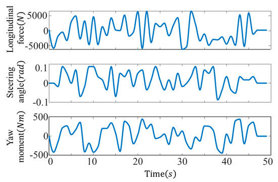 The interval between two sampling points of longitudinal force, steering angle and additional yaw moment is 2 s. The values of sampling points are stochastically generated, obeying the uniform distribution in the range of , and , respectively. The sampling data are interpolated by the Hermite method for smoothness, as shown in Figure 3.