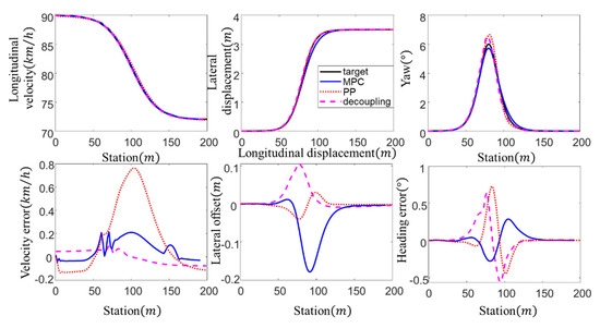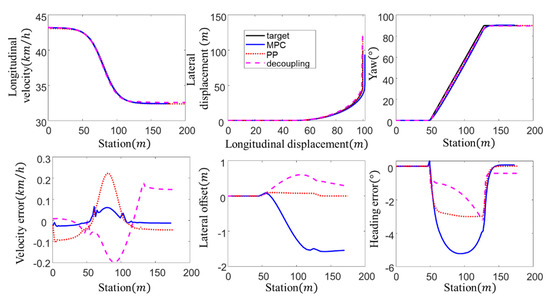 As shown in Figure 7, the real vehicle velocity and lateral position accurately follow the references. The velocity tracking error of the proposed method is smallest compared with pure-pursuit control and MPC. With the same longitudinal controller, MPC and pure-pursuit control still contribute to different speed errors, which means the longitudinal control is affected by control in other directions. Even though the lateral control value was correctly calculated by MPC, the longitudinal tracking error results in a delay in the lateral tracking owning to the lateral reference related to the time and does not consider the longitudinal error within a planning cycle, which is another deterioration of tracking accuracy caused by dynamic coupling.