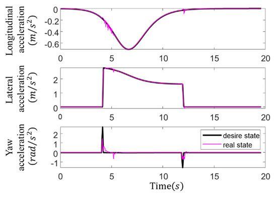 Figure 6 shows that the longitudinal acceleration, lateral acceleration of the vehicle coincide with the desired value and the change in each direction does not affect the other directions, indicating that the proposed method has decoupled dynamics and the vehicle dynamic states can be accurately tracked in close loop.