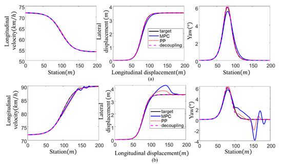 Therefore, in trajectory tracking, dynamic decoupling is an effective method to eliminate the interactions of various vehicle motion directions. To decouple the lateral and the yaw motion of the vehicle, Marino [19] calculated eigenvalues of the optimal control system by minimizing the weighted sum of the cross-transfer function. Then, referring to the target sideslip angle and yaw rate obtained from the nonlinear vehicle model, the zero-yaw rate maneuver and the zero lateral speed maneuver were guaranteed to improve vehicle handling performance. Zhang [20] derived an analytical method to decouple the motion control on vehicles’ longitudinal and lateral directions. The responses of the ideal bicycle model were followed to improve the driving safety and handling performance of the vehicle. Wang [21] adopted the inverse system to decouple lateral, yaw, and roll motions. The decoupling method can transform the coupled vehicle dynamics system into multiple parallel single input single output (SISO) sub-systems. Then, by tracking the ideal vehicle motion states, e.g., yaw rate, longitudinal acceleration and sideslip angle, the vehicle handling performance is enhanced. However, since the desired motion states are the ideal vehicle model responses according to drivers’ actual input, the decoupling method can usually only be applied in the driver-in-loop system to improve the driving stability under satisfying the driver’s intention.