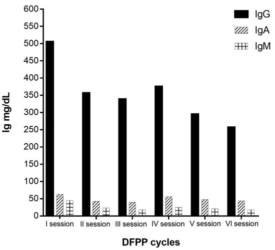 Immunoglobulin G (IgG), A (IgA), and M (IgM) concentrations during DFPP cycles.