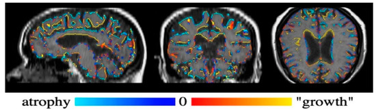 Siena output color-code imaged of the brain. Blue color indicates atrophy; red color indicates growth. Note the prevalence of blue in the grey matter and peripheral grey matter.