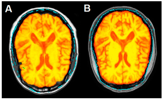 Pre-to-post registration axial images of the brain, before (A) and after (B) the DFPP procedure respectively, identified using the Siena tool of the FSL software. Yellow color indicates the brain parenchymal fraction, red color the ventricular system and subarachnoid spaces. Given the 2.14% reduction of total intracranial volume (TIV), note the expected prevalence of the red color in B indicating the involvement of subarachnoid spaces, with TIV = 1300.4 mL with respect to A with TIV = 1328.8 mL.