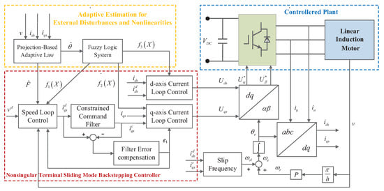 In recent years, a model reference adaptive indirect vector control method based on rotor time constant has been proposed and applied to LIM system with end effects to compensate for the bad influence brought by end effects in indirect vector control, achieving robust control of LIM speed [5,7,8]. To get better control performance, many nonlinear control methods are applied to LIMs, such as backstepping control [8,9], adaptive control [10,11,12], fuzzy control, neural network control [13,14,15] and sliding mode variable structure control [9,16,17]. Among them, backstepping is a useful tool for dealing with uncertain nonlinear systems. Backstepping is widely paid attention to with its distinct controller design principle and easy combination with modern control techniques to eliminate the influence of time-varying parameter and external disturbances on the system performance. Scholars have put forward many methods to solve the computational expansion problem such as dynamic surface control [18,19] and constrained command filter [8,20,21]. In [8], the adaptive backstepping control method is studied with fuzzy logic technique for LIM. However, it lacks measures to ensure the robustness and dynamic performance when facing end effects in LIM. In [18], a disturbance-observer based fast terminal sliding mode backstepping control is proposed for uncertain nonlinear systems, where the first-order filter is introduced to solve the computational expansion problem in the high-order backstepping control system. However, the design process and structure of the disturbance observer is complex, which increases the cost of computation and difficulty of controller design for LIM with end effects. Besides, the influence of the filtering error of the first-order filter on the system is not considered. Hence, more work shall be implemented against these problems on the control of LIM.