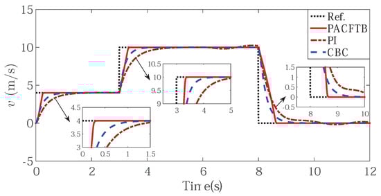 In order to test the effectiveness of the proposed PACFTB, the conventional command-filtered backstepping controller (CBC) and PI controller were applied as comparisons to demonstrate the better performance of the designed controller. In simulation, the given d-axis current is 80 A, and the given velocity was set as follows: