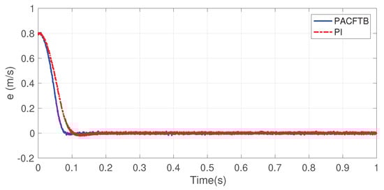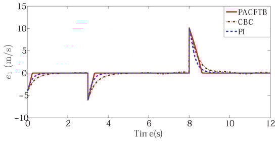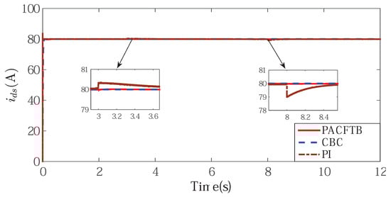 Meanwhile, external disturbances were added in 6 s. The signal curves in the simulation are shown in Figure 4, Figure 5, Figure 6, Figure 7, Figure 8 and Figure 9. By comparing the diagrams of Figure 4 and Figure 5, the PACFTB had faster convergence than CBC and PI controller, which declared the better dynamic performance of PACFTB. In addition, it can be found that PACFTB had better static and dynamic performance than CBC and PI controllers when external load disturbance changed. From the point of view of indices, the response time of our designed controller was shorter than that of PI controller, and shorter than that of traditional CBC controller. Moreover, the chattering rate of PI caused by external load disturbances was about while that of PACFTB is nearly , which expressed the better performance of PACFTB as well.