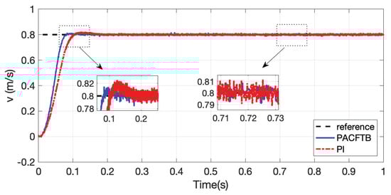 Based on the adjustment parameters, the control performance could be achieved, which is shown in Figure 11 and Figure 12. It is shown in Figure 11 that the speed of PACFTB tracked the reference well with quick response and little tracking error. In contrast, the PI control was applied to the experiment as well for speed tracking of LIM. It can be seen that the speed under PI control reached the reference first after 0.1 s while the speed under PACFTB mae it before 0.1 s, which showe better dynamic performance of the proposed PACFTB controller. Furthermore, the chattering at the stable state of PI control was a little more than that of PACFTB controller, which demonstrated better static performance of the proposed PACFTB controller. Thus, the proposed PACFTB control strategy possessed sound static and dynamic performance according to the discussion of experimental results.